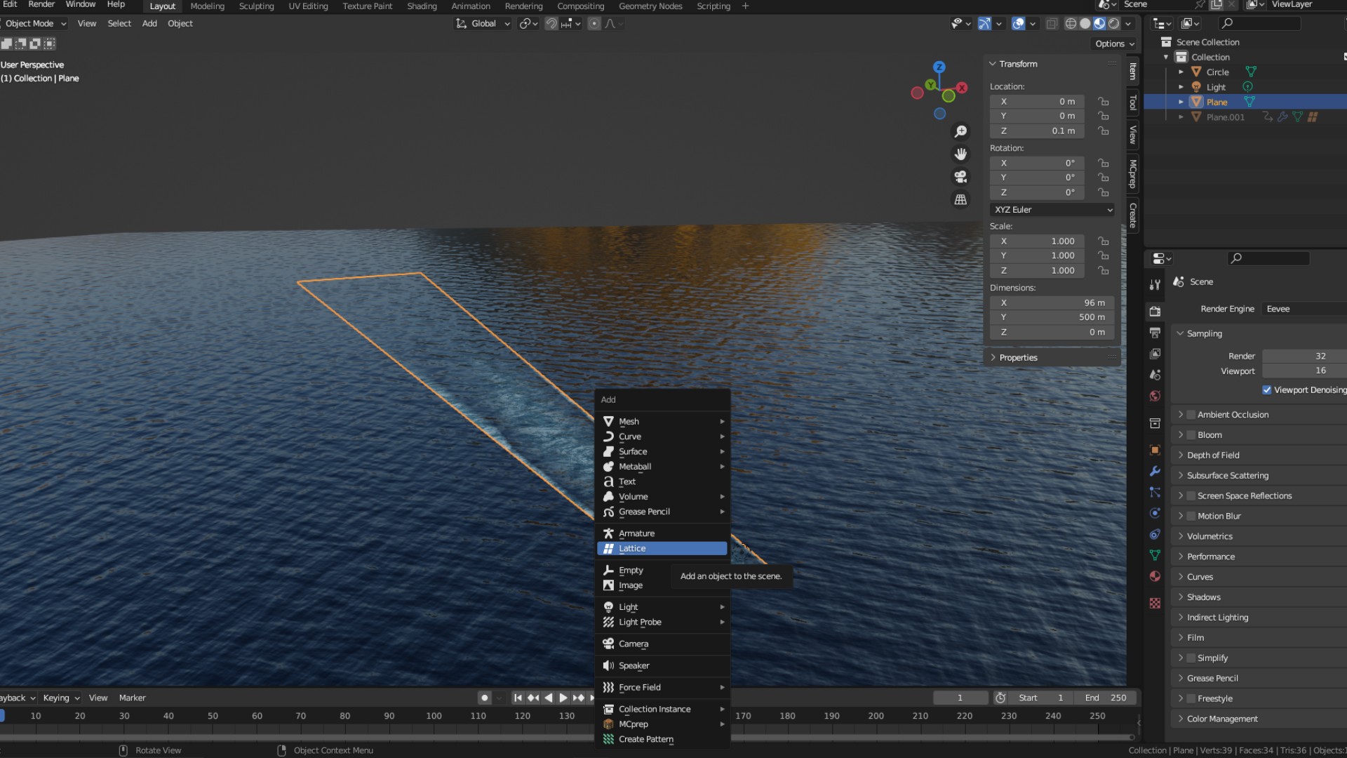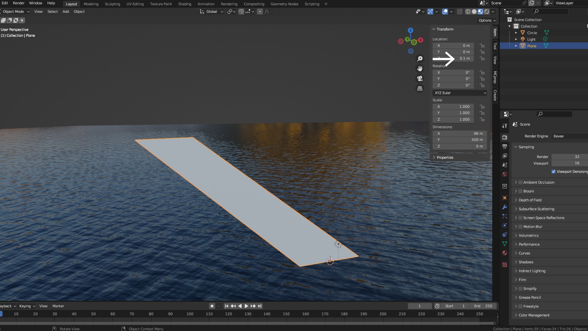 最後に、平面が海と重なってちらつくので、オブジェクトモードに戻り、Z=0.1 m くらいに浮かせて置きます。