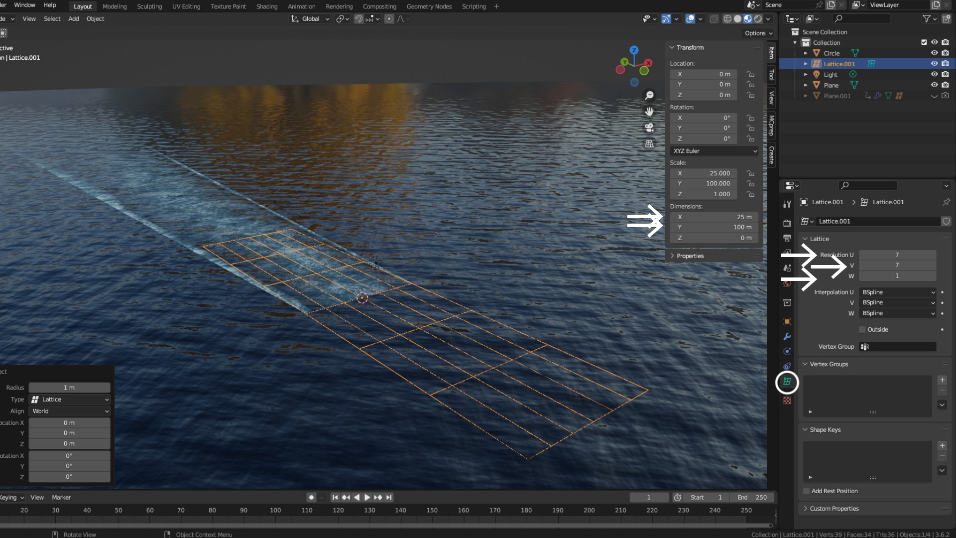 Nキーでサイドバーを開き、Item > Dimensions: X=25 m / Y=100 mにしておおよその大きさを調節しておきます。また、画面右下Object Data Properties(緑のラティスのタブ)の Resolutionを U=7 V=7 W=1にします。