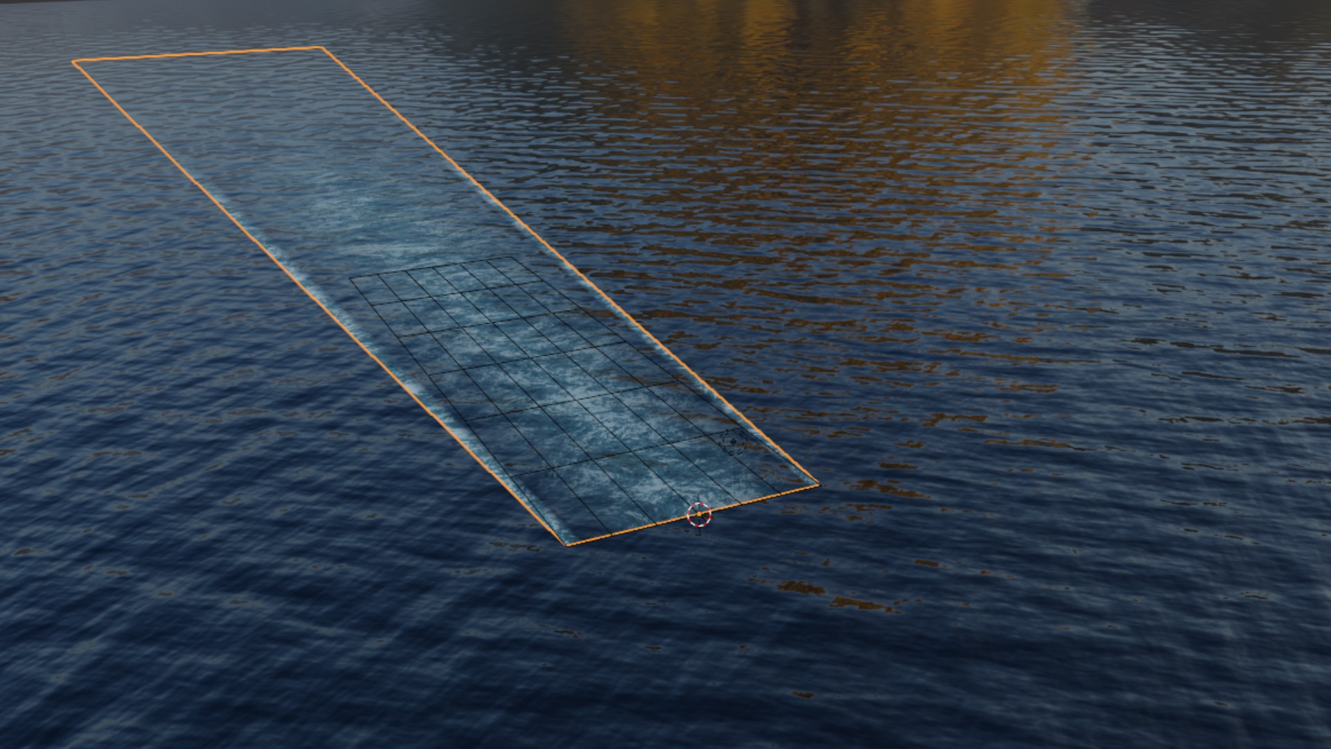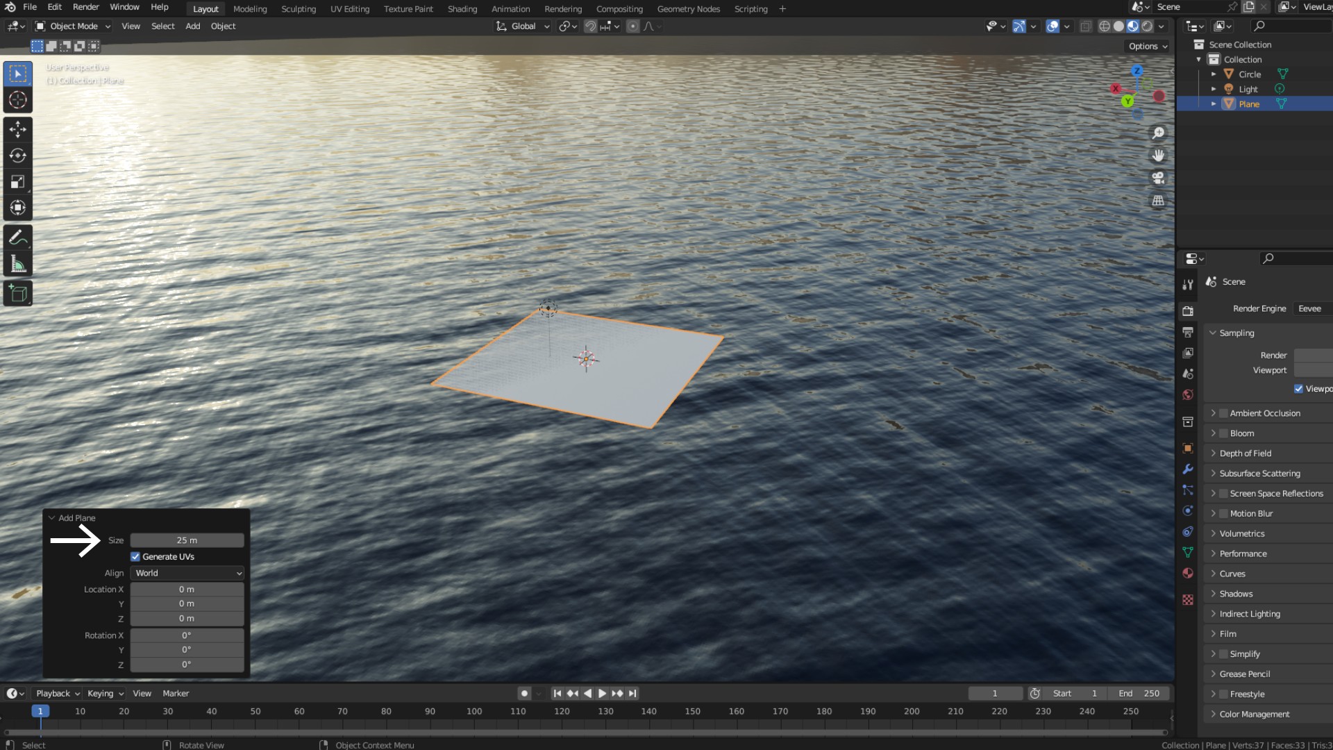 平面を追加します。Sizeは船の幅に合わせて設定しますが、今回は25 m にしました。
