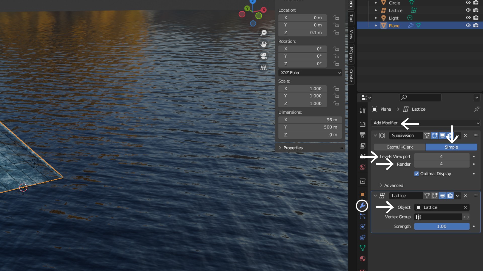 平面を選択し、画面右下Modifier Properties(スパナのタブ) > Add Modifier > Generate > Subdivision Surfaceをクリック。 続けてラティスモディファイアを追加します。Add Modifier > Deform > Latticeをクリック