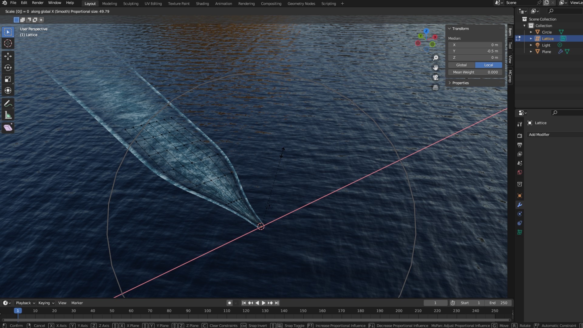 もし船に合わせて幅を変えるなら、Aでラティスのすべての点を選択し、S Xと入力してドラッグします。