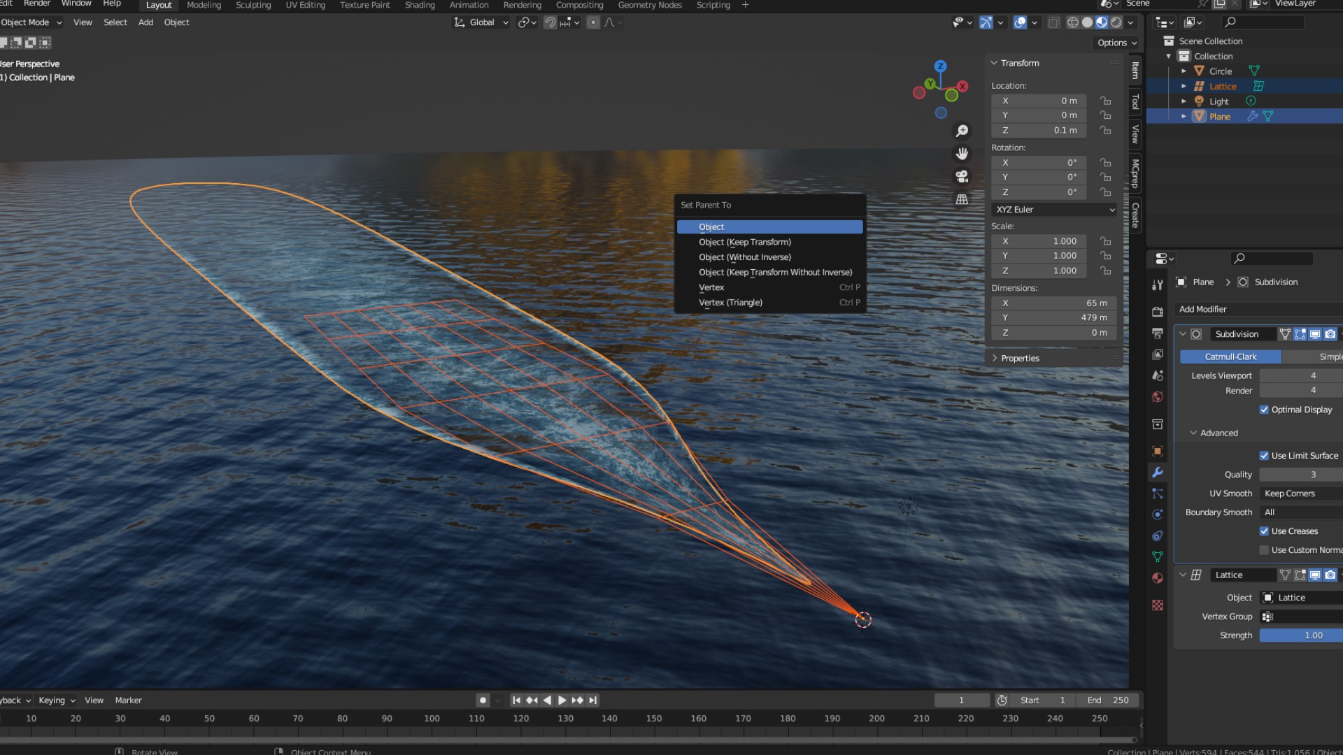 ラティスは3Dビューの中では選択しづらいので、アウトライナー上でラティス→平面の順にCtrl+クリックで選択します。平面が明るい黄色で表示されているのを確認してCtrl+Pを押すとメニューが表示されるのでObjectを選択します。