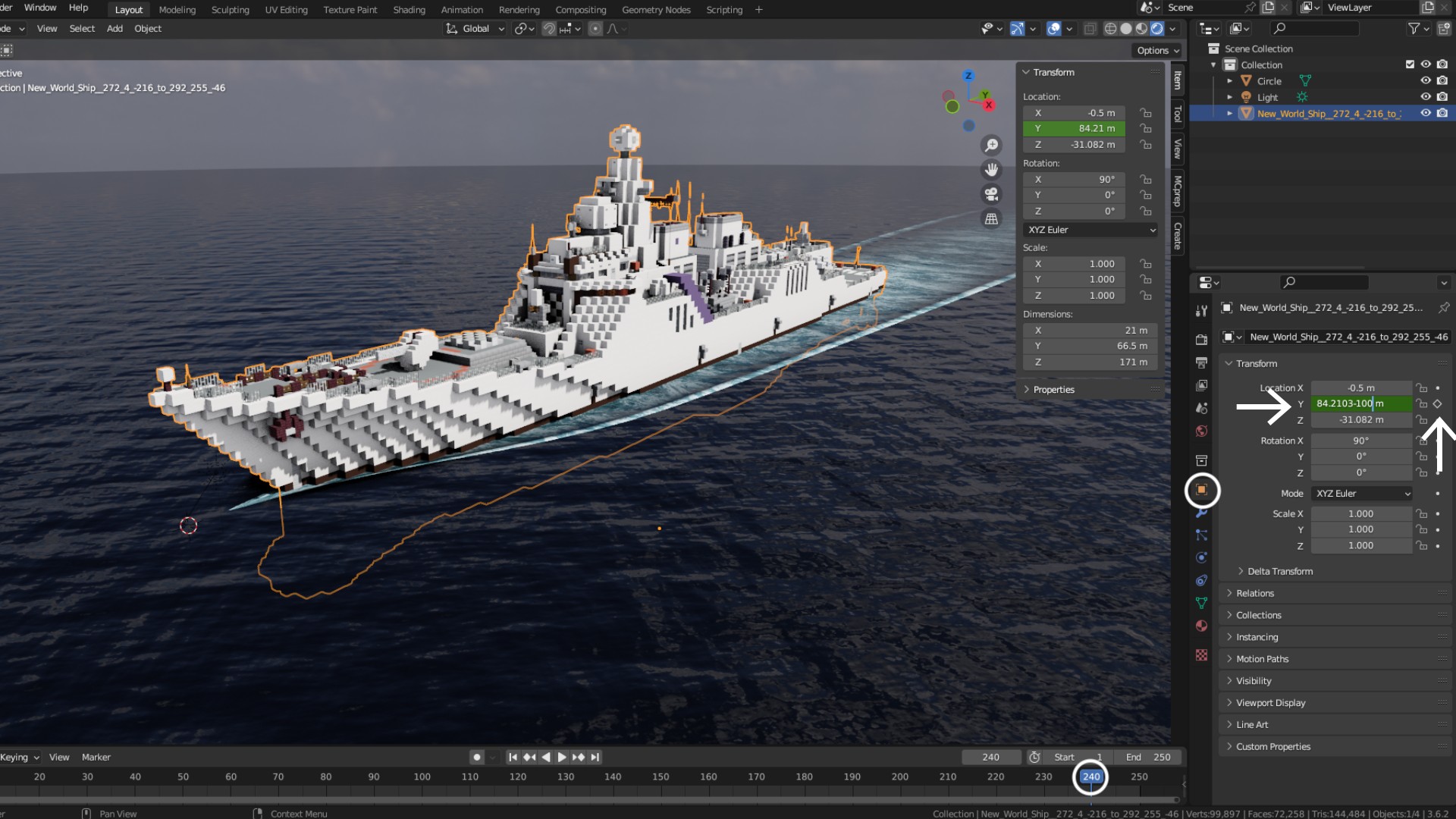 船の動きはキーフレームで作ります。10 m/s で 20 knotくらいですので、このスピードで動かしてみます。タイムライン上で現在位置を0フレーム目にし、船を選択した状態でLocation Yにキーフレームを打ちます。 続けて、240フレーム目に移動し、Location Yの現在値に続けて-100と入力してキーフレームを打ちます。