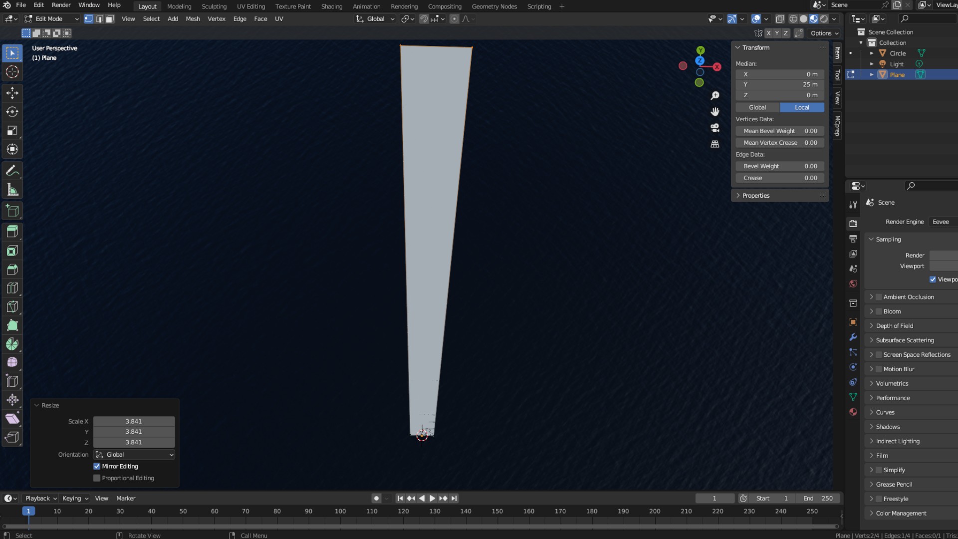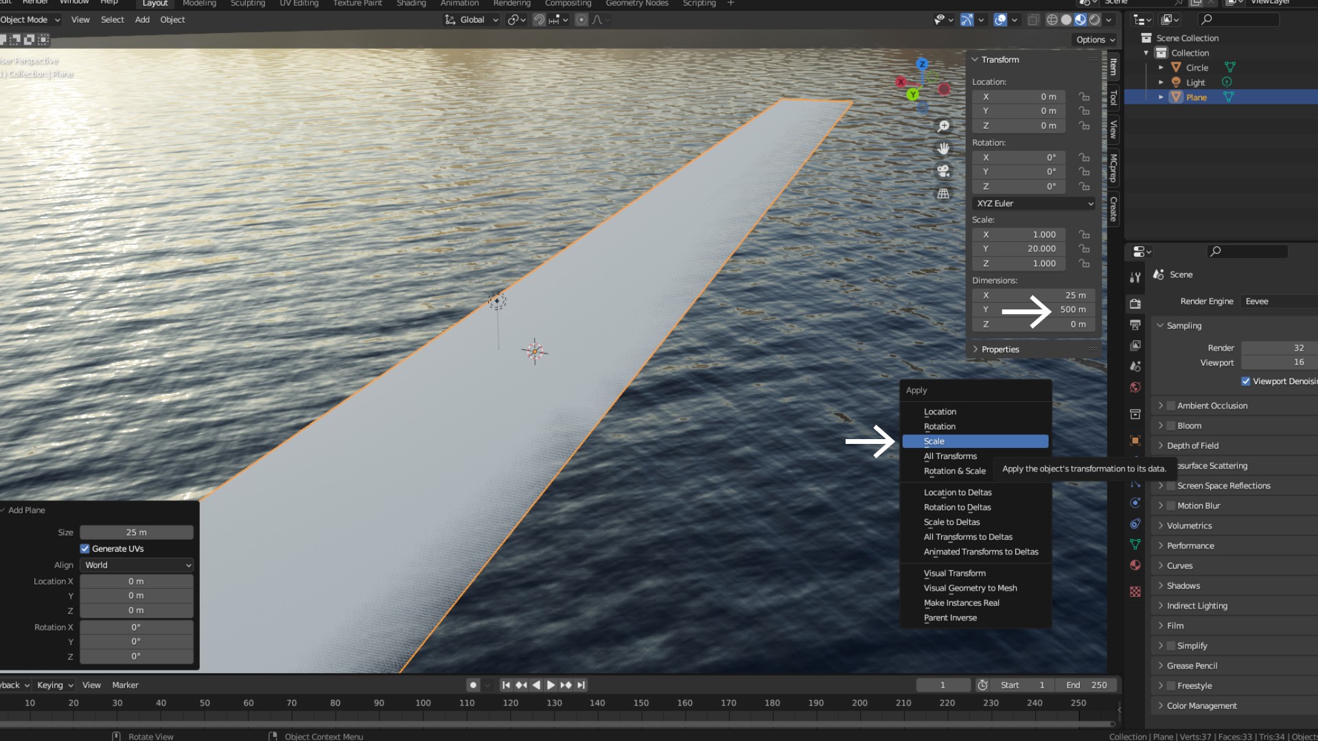 平面を細長くします。Nキーでサイドバーを開き、Item > Dimensions > Y=500 m と入力します。Ctrl+AでApplyメニューを開き、Scale を選択してスケールを適用しておきます。