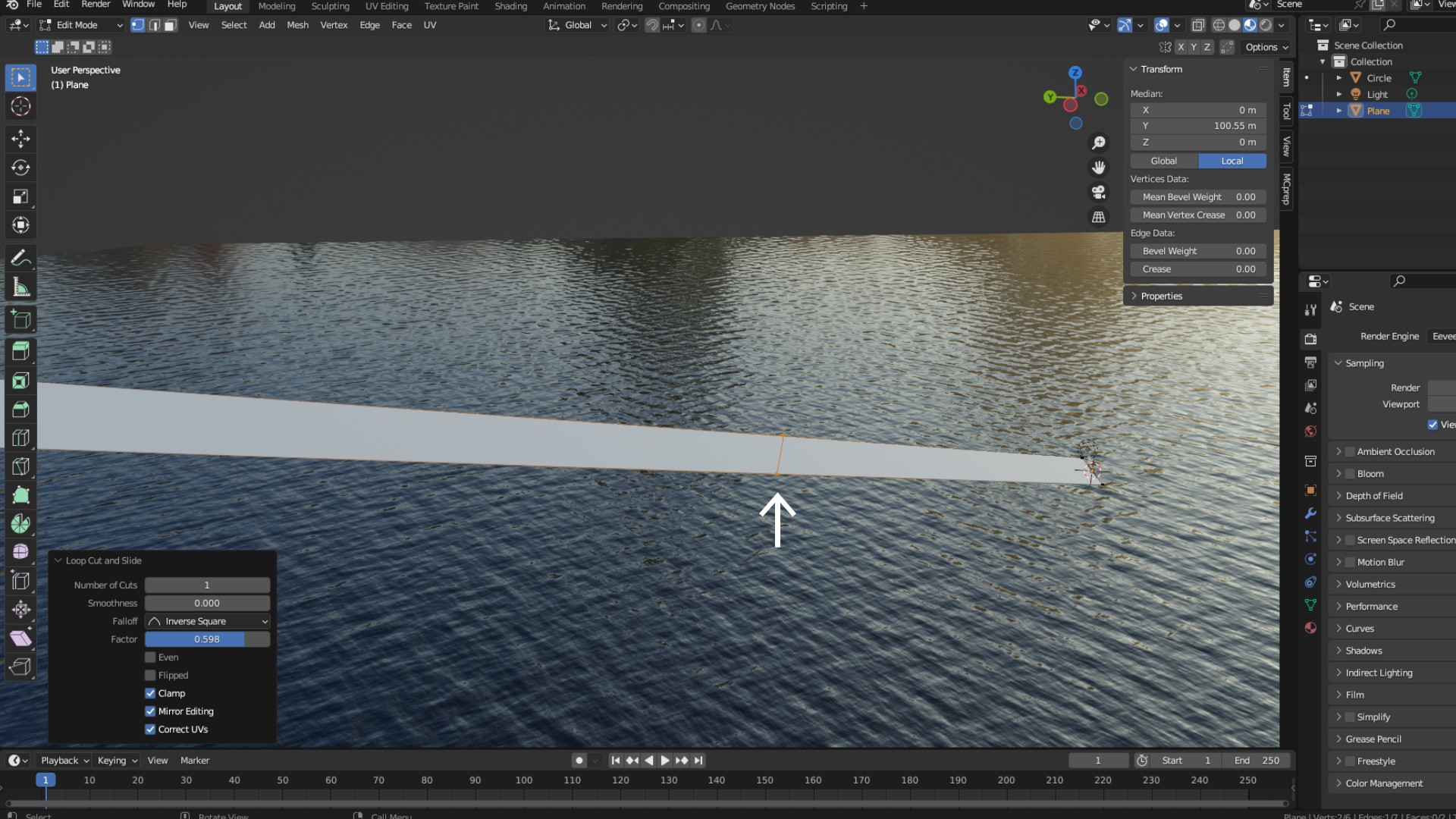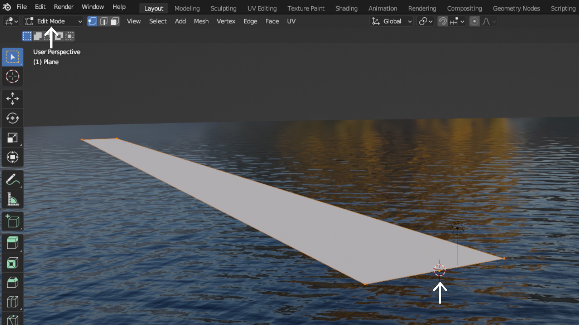 その前に当然ですが、すでに海を作っていなければなりません。海洋モディファイア(Ocean Modifier)を用いた海の作り方も紹介しています。 また、船の進行方向はY負の方向としています。大抵この向きで製作されると思いますが、違うなら最後に平面そのものを回転させて対応してください。