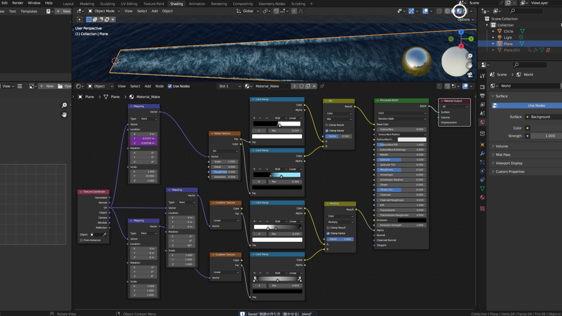 平面を選択した状態で、ノードエディターの+Newをクリックし、新しいマテリアルを作成します。名前は適当に変更しておいてください。(Material_Wakeにしておきました。)
