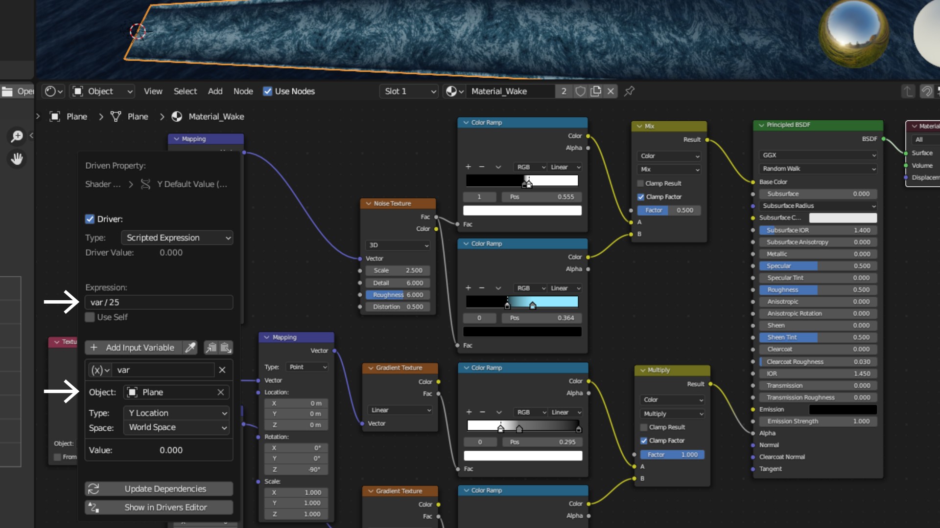 続いて同じノードのLocation Yを右クリックしAdd Driverをクリック、出現したメニューのスポイトマークをクリックしてから平面自身を選択します。また、上の計算式の入力フィードに、「var」と表示されていますので、これを「var / 25」に変更します。