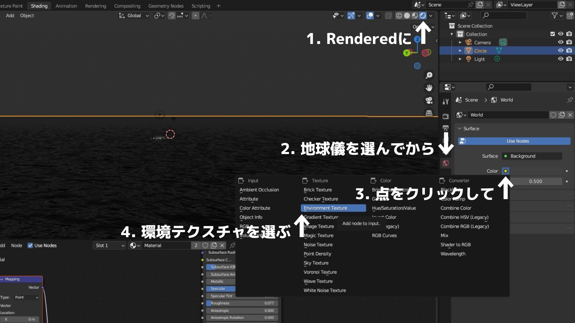 まず、背景の設定です。画面右上の球体が四つ並んでいる中の一番右を選択してレンダーモードにしておきます。 これがレンダリング結果になるのですが、背景が無くなり真っ暗になったのではないでしょうか。今回は背景を作るために環境テクスチャを利用しますので、まずは背景となる画像を用意しなければなりません。 画像は以下のWebサイトから入手しました。地球儀のタブを開いて、colorの横の点をクリックし、Environmental Texture(環境テクスチャ)を選択します。 すると、その下にOpen(フォルダを開く)が出現するので、先ほどダウンロードした画像を選択します。すると、空が現れます。