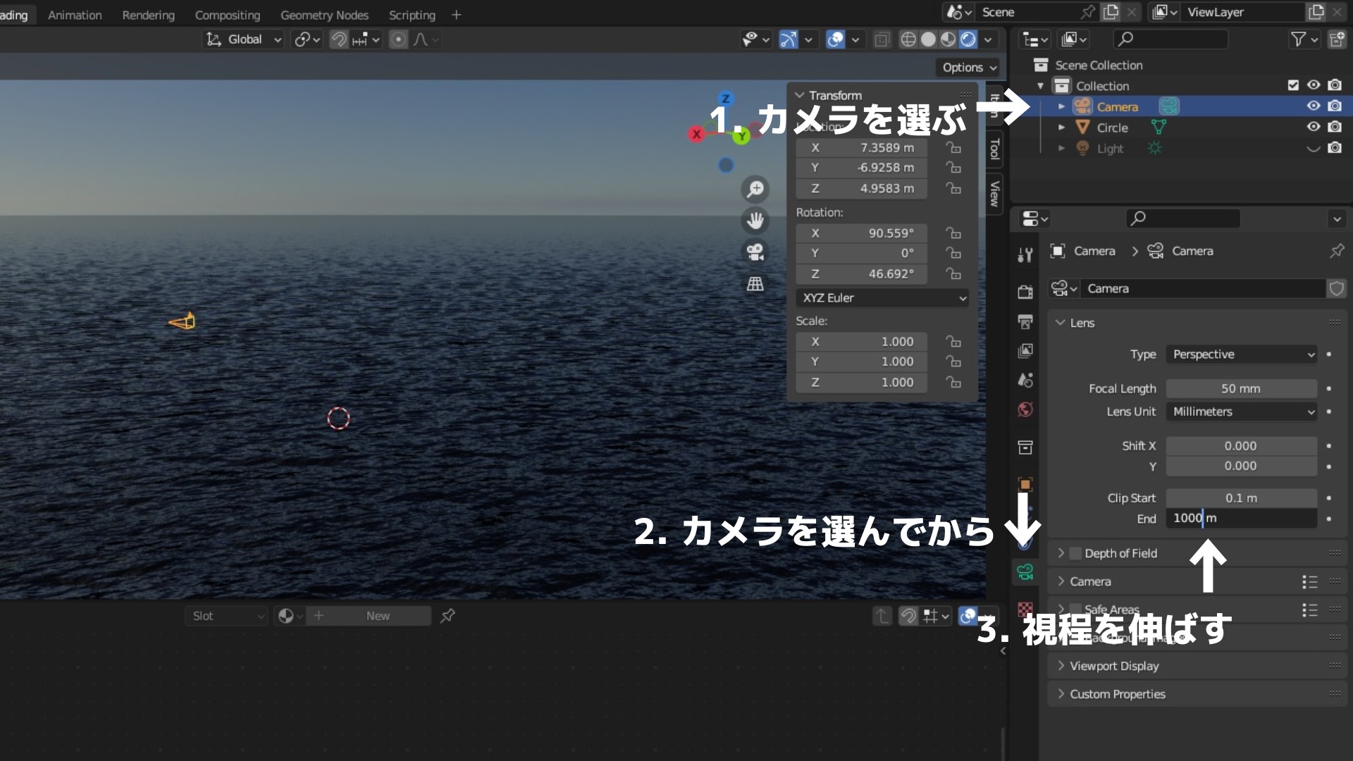 ここまで完了したら、カメラの向きを調節してレンダリングしてみましょう。