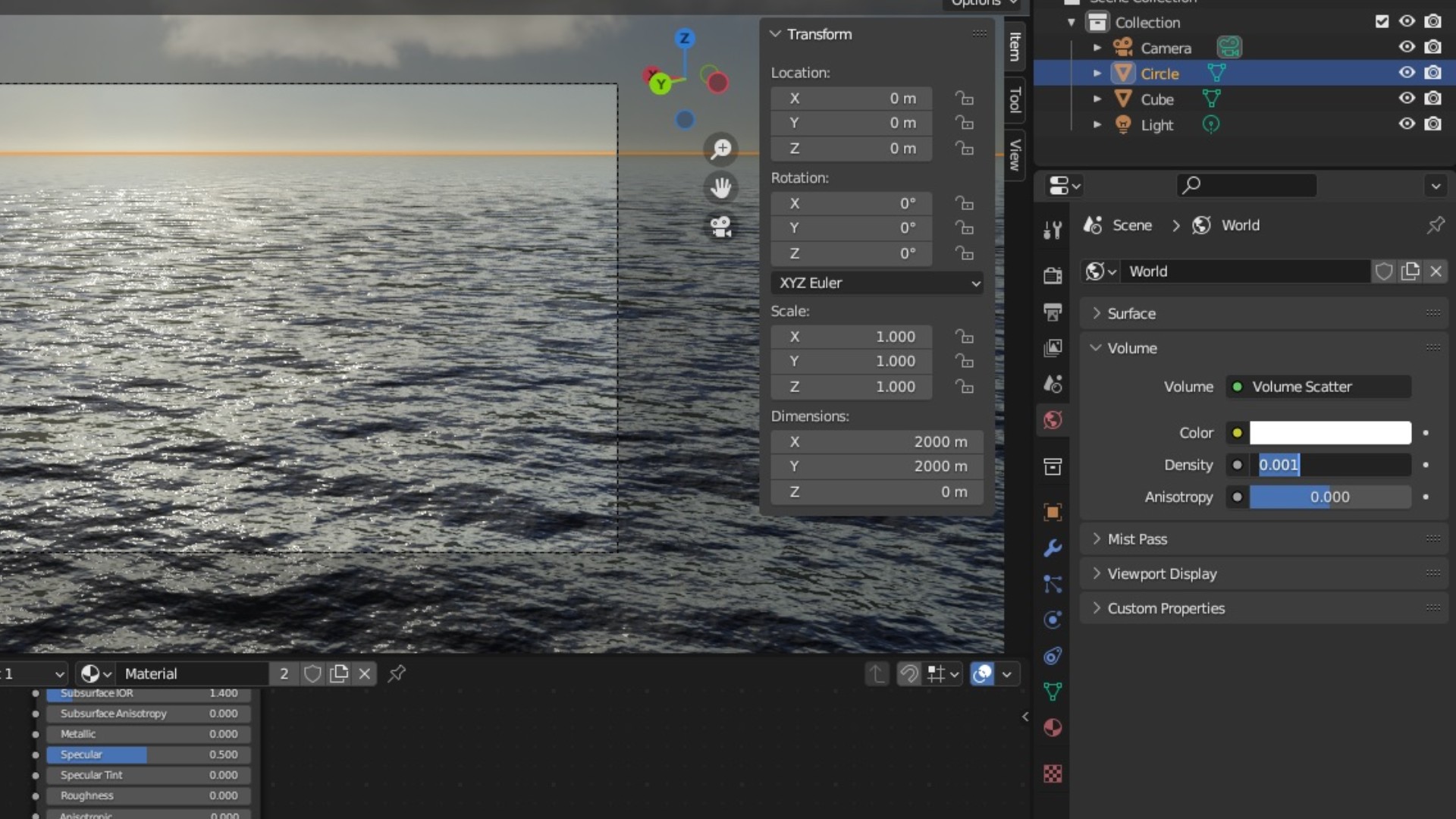 shift+aでmeshの追加を選び、更にcircleを選びます。すると、輪っかが出現すると同時に画面左下にメニュー(『最後の操作を調整』メニュー)が出てくるので、これをクリックします。 Fill Typeがnothingになっていると思うので、これをTriangle Fanに変更しておきます。これでやっと、海面を作れたということですね。 さらに、上のRadiusを大きな数値(1000mくらい)に変更し、あなたの納得できる広さの海を作ってください。