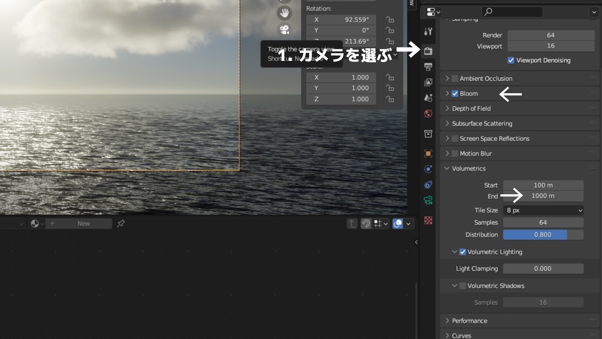 同じくレンダープロパティの"Bloom"の項目にもチェックを入れて置きます。bloomは光が当たっている部分がぼわっと広がる表現で、逆光下で大きく印象が変わります。