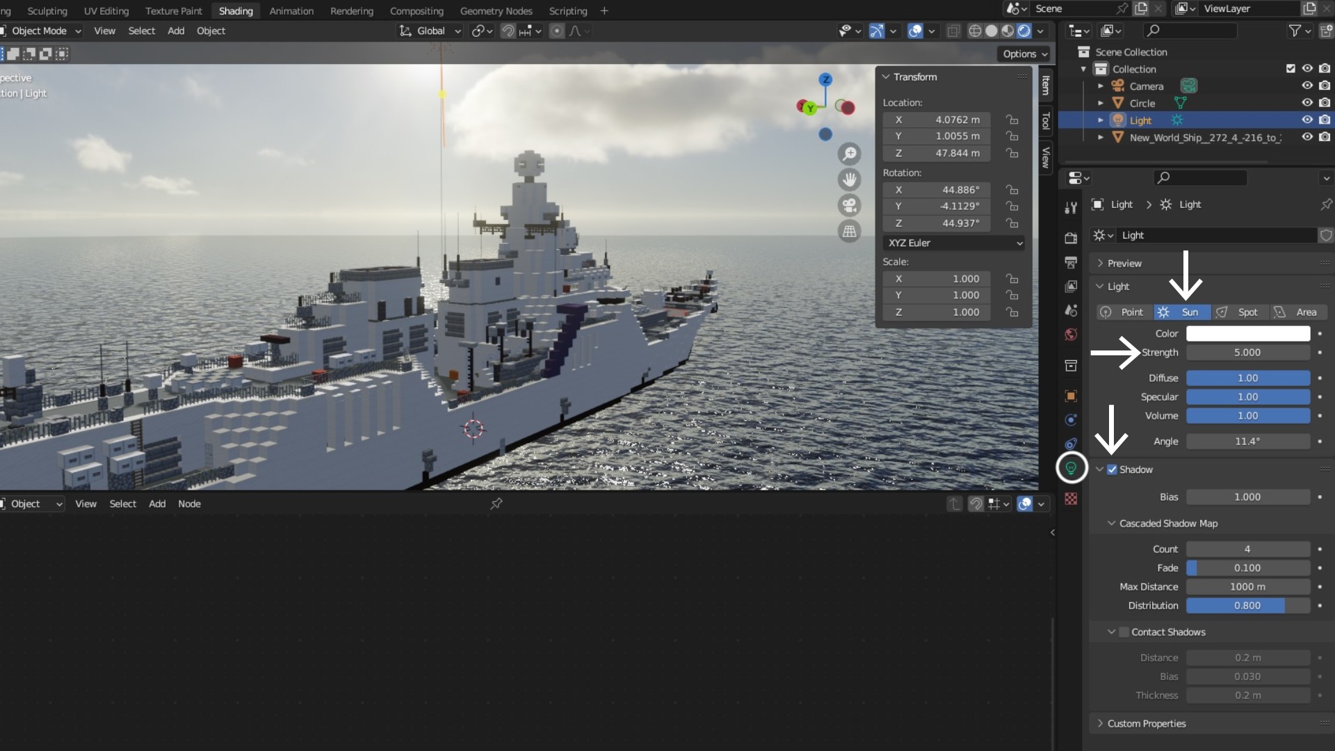 マインクラフトの作品をインポートして撮影してみましたが、ノッペリした感じになってしまっていますね。 eevee では影を作るために別途光源を設置する必要があります。ライトオブジェクトを選択して、電球アイコンの中の光源の種類を太陽に、強さを5から10程度に、そしてShadowにチェックを入れます。