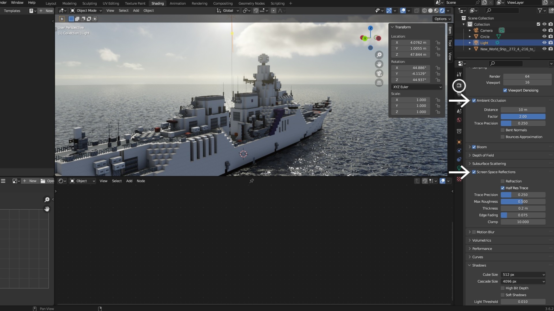 もう一つ、重要な項目があります。レンダープロパティに戻り、アンビエントオクルージョンとスクリーンスペースリフレクションにチェックを入れます。