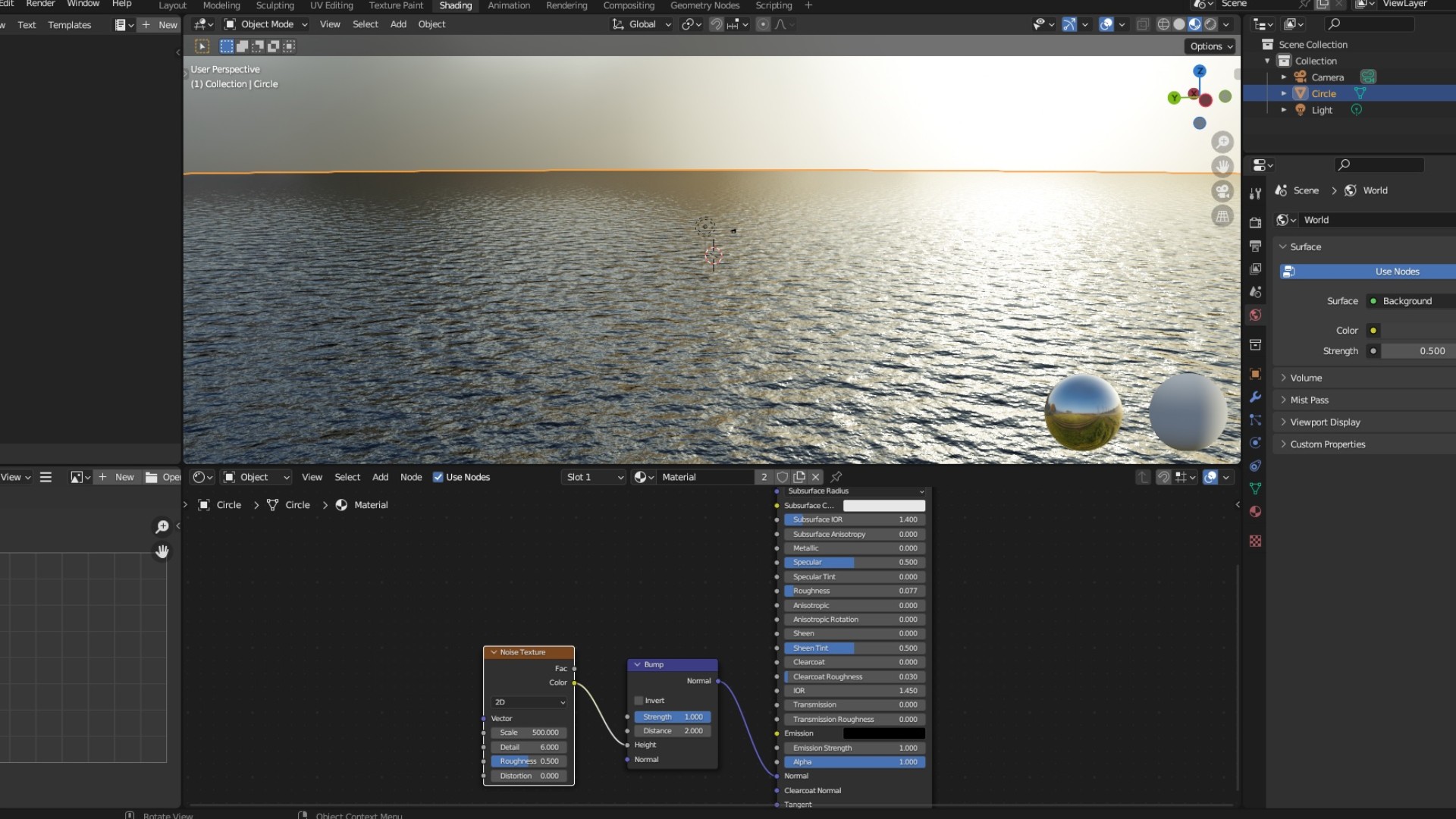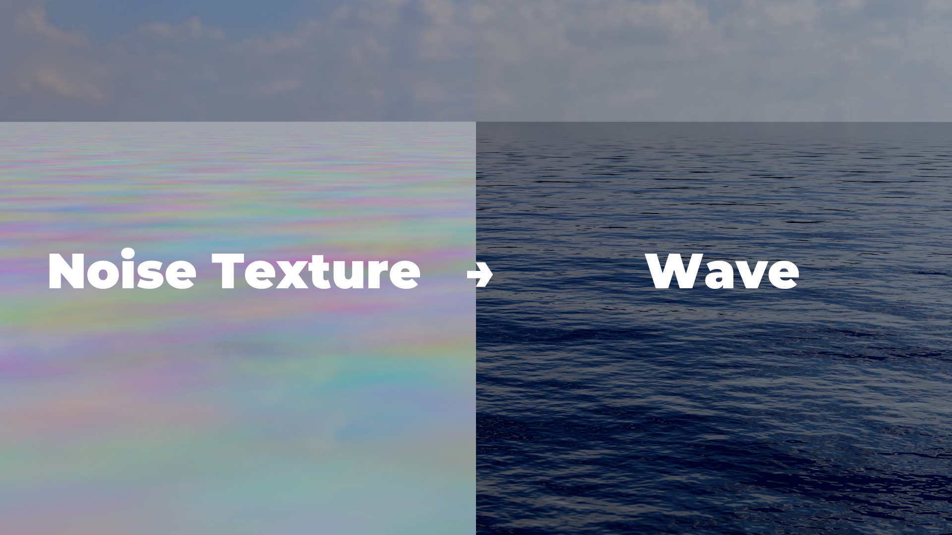 かなり海っぽくなっていますが、トップの画像と比べてみたください。なんか違いますね。この使い方は間違っています。ノイズテクスチャの後に、bumpノードを追加しなければなりません。 (ノイズテクスチャを直接ノーマルマップとして使用するより、ハイトマップとしてそれをノーマルに変換する方が綺麗になるからです。)