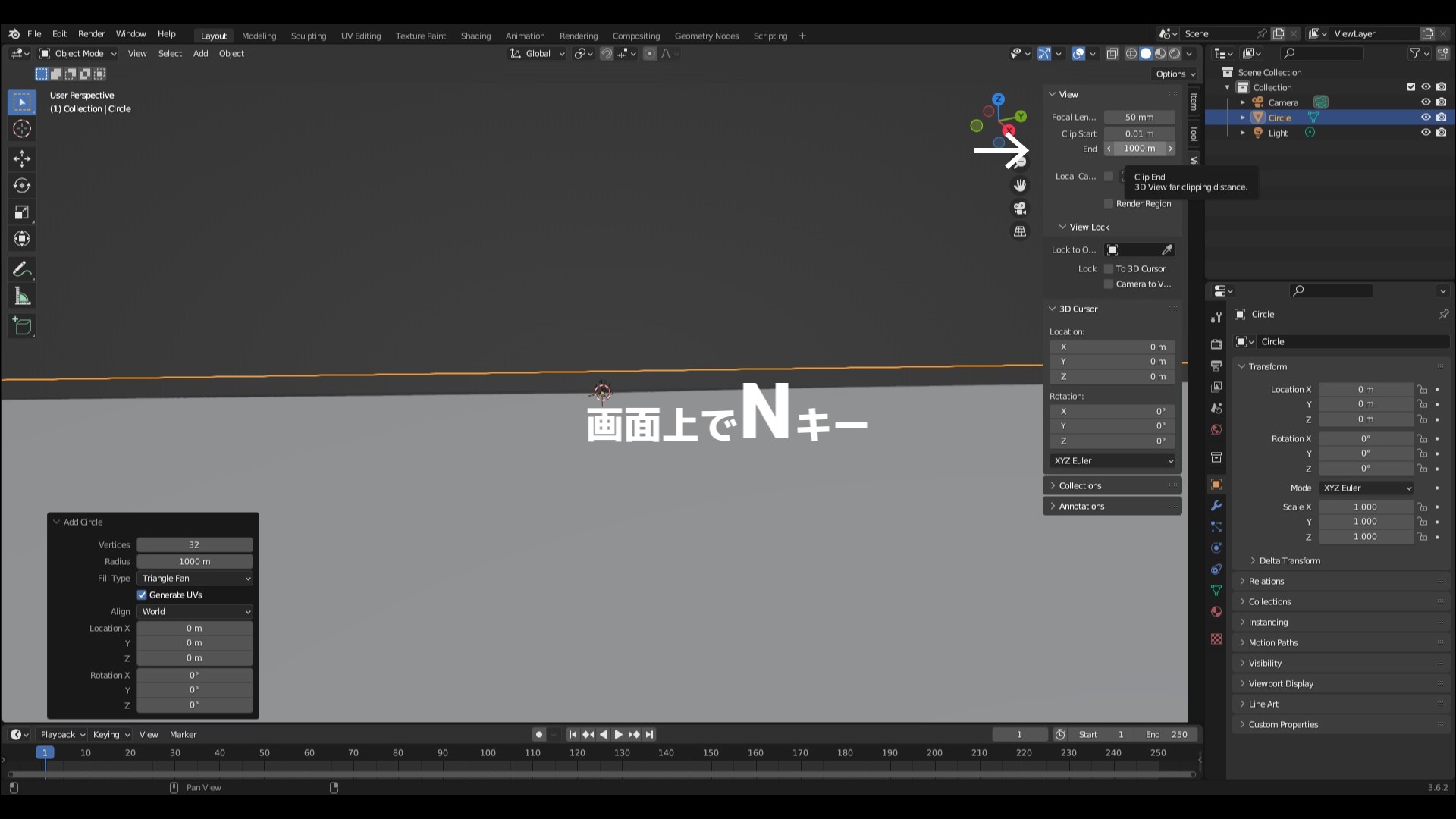 ここで、海の広さを確認しようとズームアウトしていくと、 表示がおかしいことに気づくかもしれません。これは、ビューポートに表示される範囲が制限されているからです。 そんな時は、マウスカーソルをビューポート上において、Nキーを押下しましょう。サイドバーが表示されます。 サイドバーのViewタブの中の、Clip Start/EndのEndの方に0をひとつ付け足します。するとちゃんと表示されたのではありませんか? 次はいよいよこの円盤に波を立たせますよ。