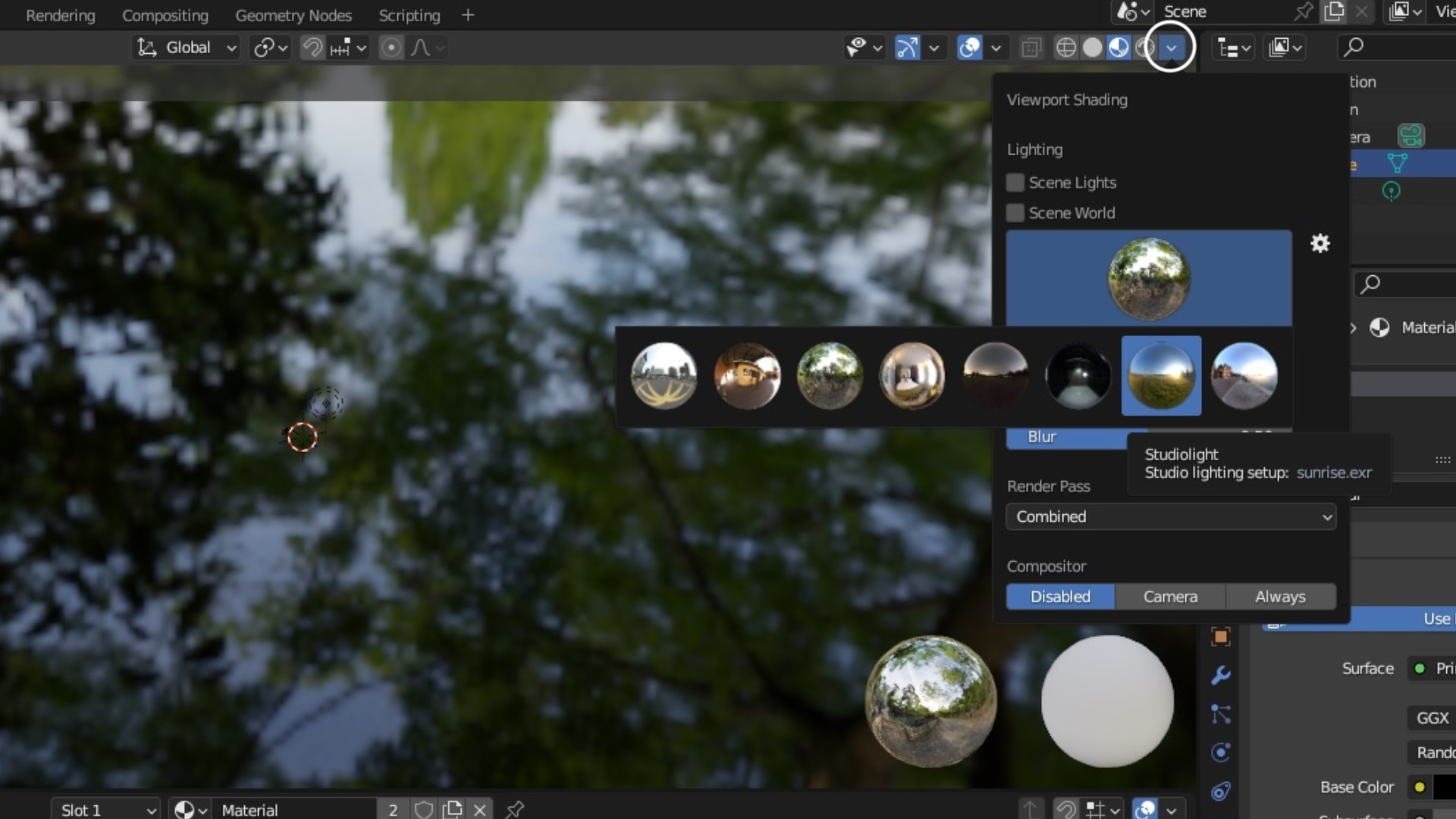 ちなみに、右上の円が四つ並んでいるところ(ビューポートシェーディング)の右の下三角 をクリックすると、背景を選択できます。青空のものにしておくと海っぽくなりますよ。