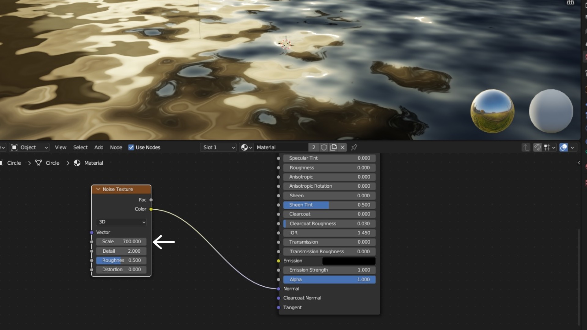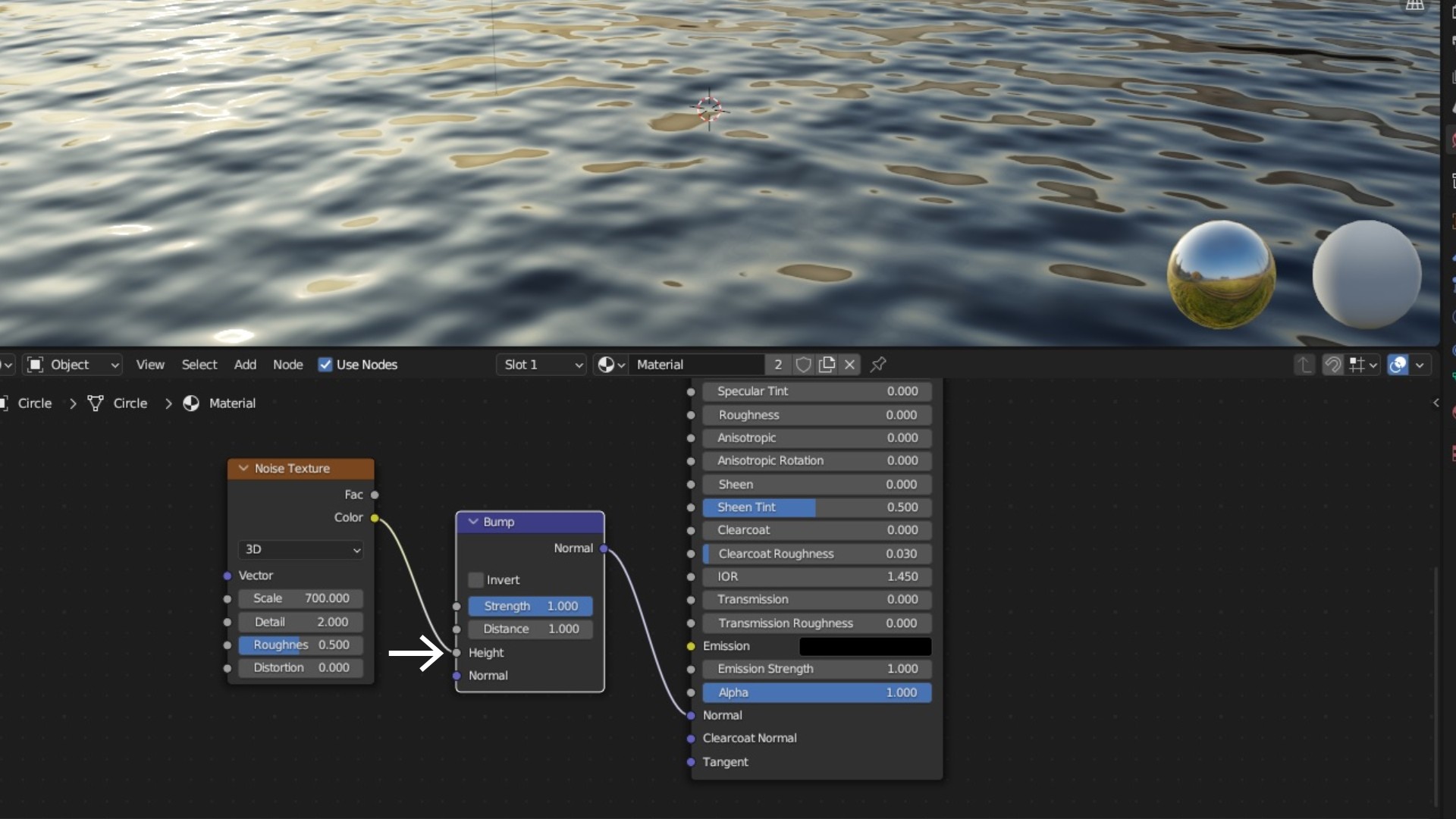より綺麗で現実的な波にするために、細かい設定を弄っていきます。まず、ノイズテクスチャノードの"Detail"を6に上げます。すると海面に寄って行ったときに細かい波増えているのがわかります。 次にBumpノードの"Distance"を2くらいに上げます。これは遠巻きに見たときの波のくっきりさが変わりますが、上げ過ぎると不自然なのでお好みで調節してください。